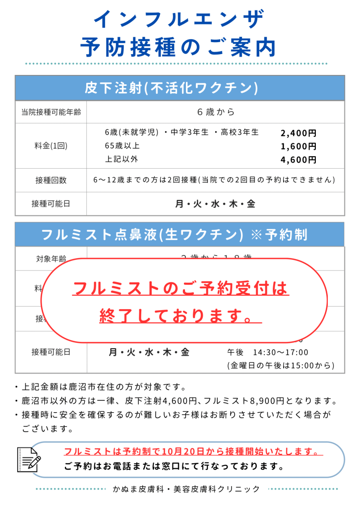 2025年10月よりインフルエンザの予防接種を行なっております。